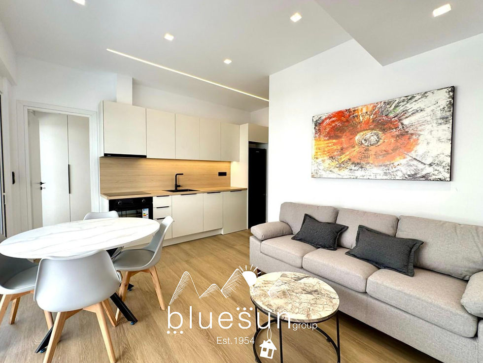 This modern-style apartment, situated on the second floor, spans 47 square meters and features an open-plan fully equipped kitchen and living room area, two bedrooms, and a bathroom. The property is fully furnished.